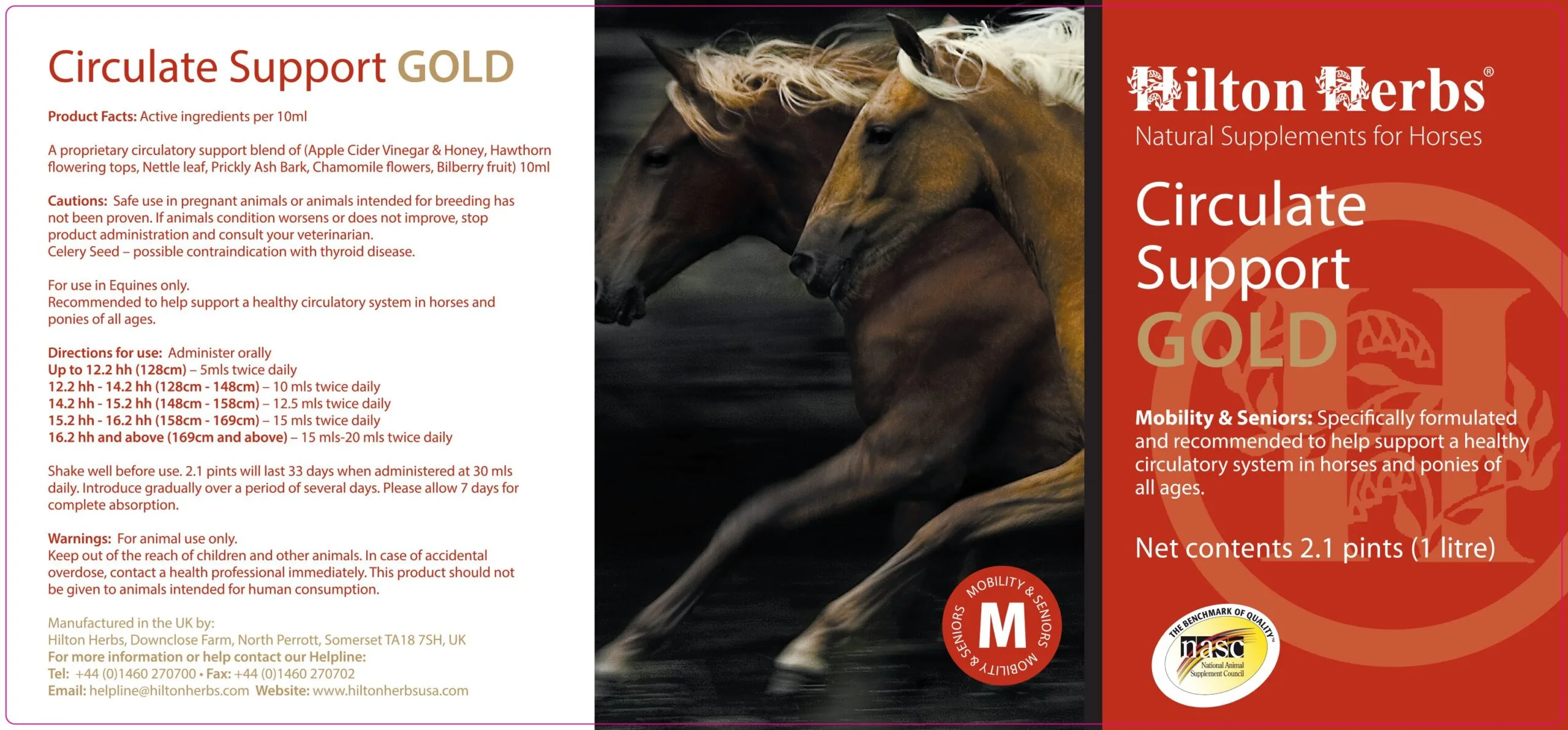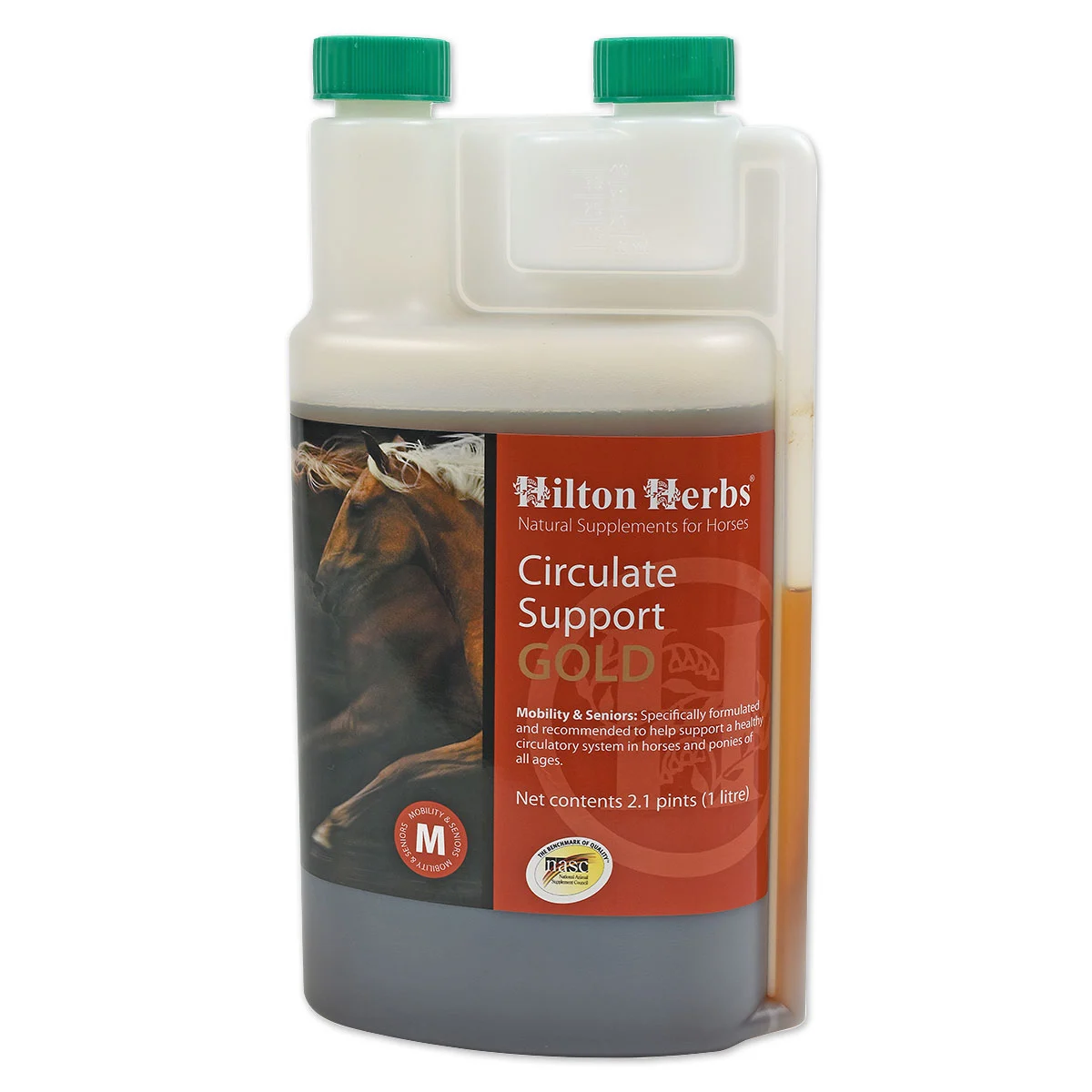 Circulate Support Gold is a liquid herbal supplement formulated by Hilton Herbs to maintain and support an efficient circulatory system and help promote normal blood flow in horses. It provides a targeted combination of herbs, including prickly ash bark, bilberry fruit, chamomile flowers, nettle leaf, hawthorn berries, celery seed, and burdock root.