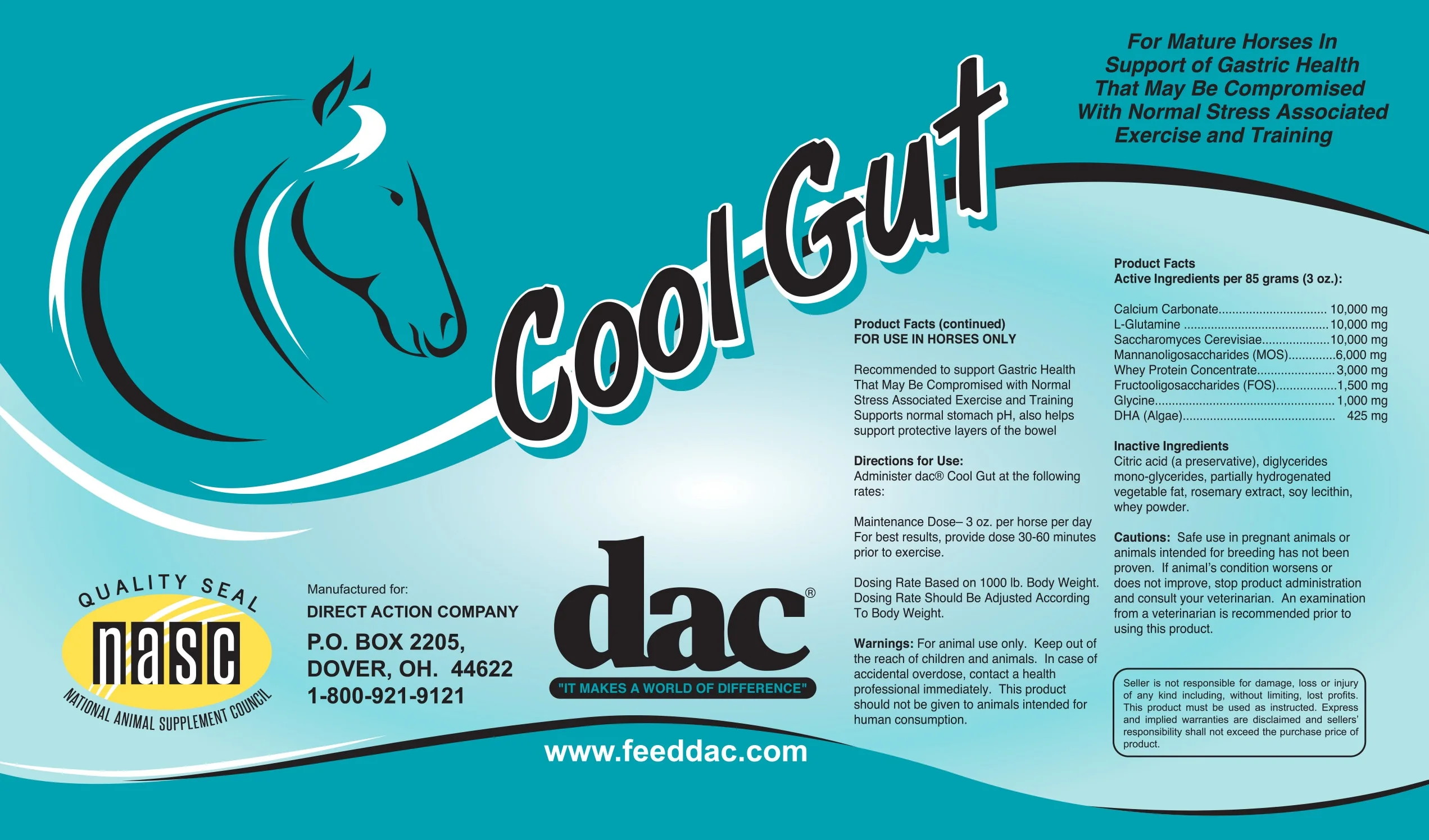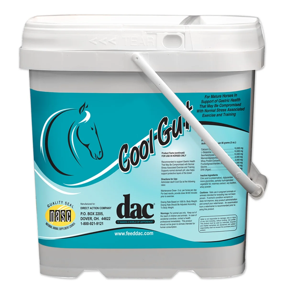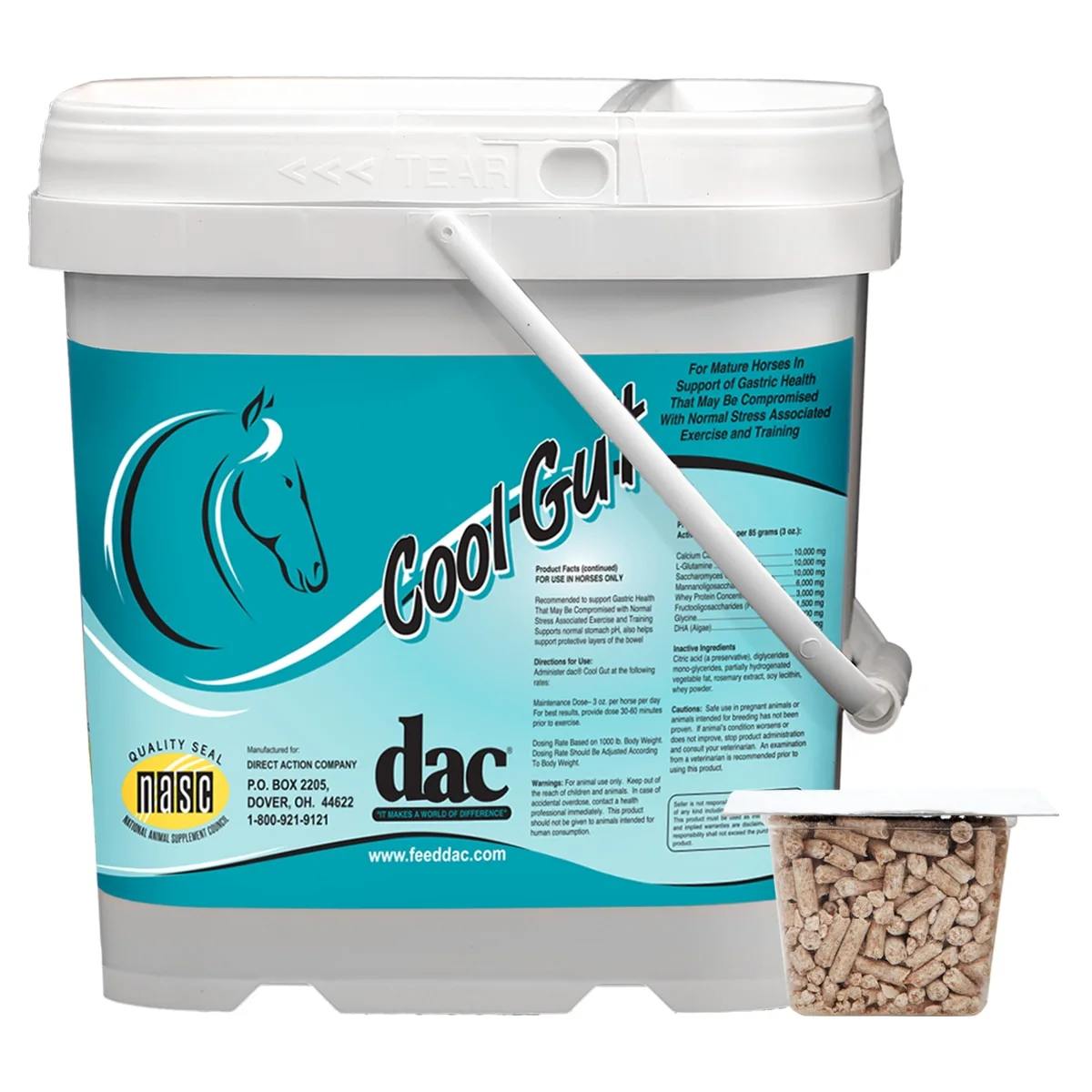 dac® Cool Gut is designed to support gastric health in horses who are exposed to the normal stress associated with exercise and training. The targeted ingredients in this formula include l-glutamine, an amino acid that is essential to the growth and function of your horse’s stomach lining, and calcium carbonate, which helps maintain proper gut pH and proper gut flora. In addition, this formula provides fructooligosaccharides (FOS) and mannanoligosaccharides (MOS), which are prebiotics that support the beneficial bacteria in your horse’s hindgut. Finally, it contains glycine and whey protein concentrate, which both support a healthy stomach lining.