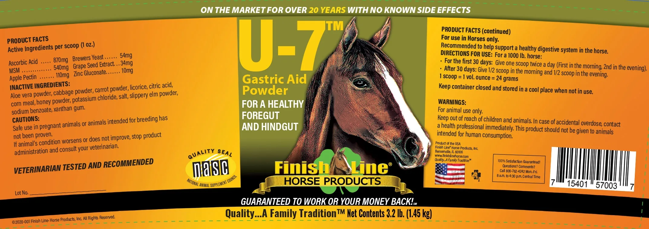 U-7 Gastric Aid is a clinically studied vitamin/herbal blend designed to support gastric health in horses with a poor appetite, poor attitude, dull coat, or reduced performance. U-7 Gastric Aid is also recommended for all horses that are confined to stalls or engaged in moderate to heavy work schedules, and is appropriate for foals.
