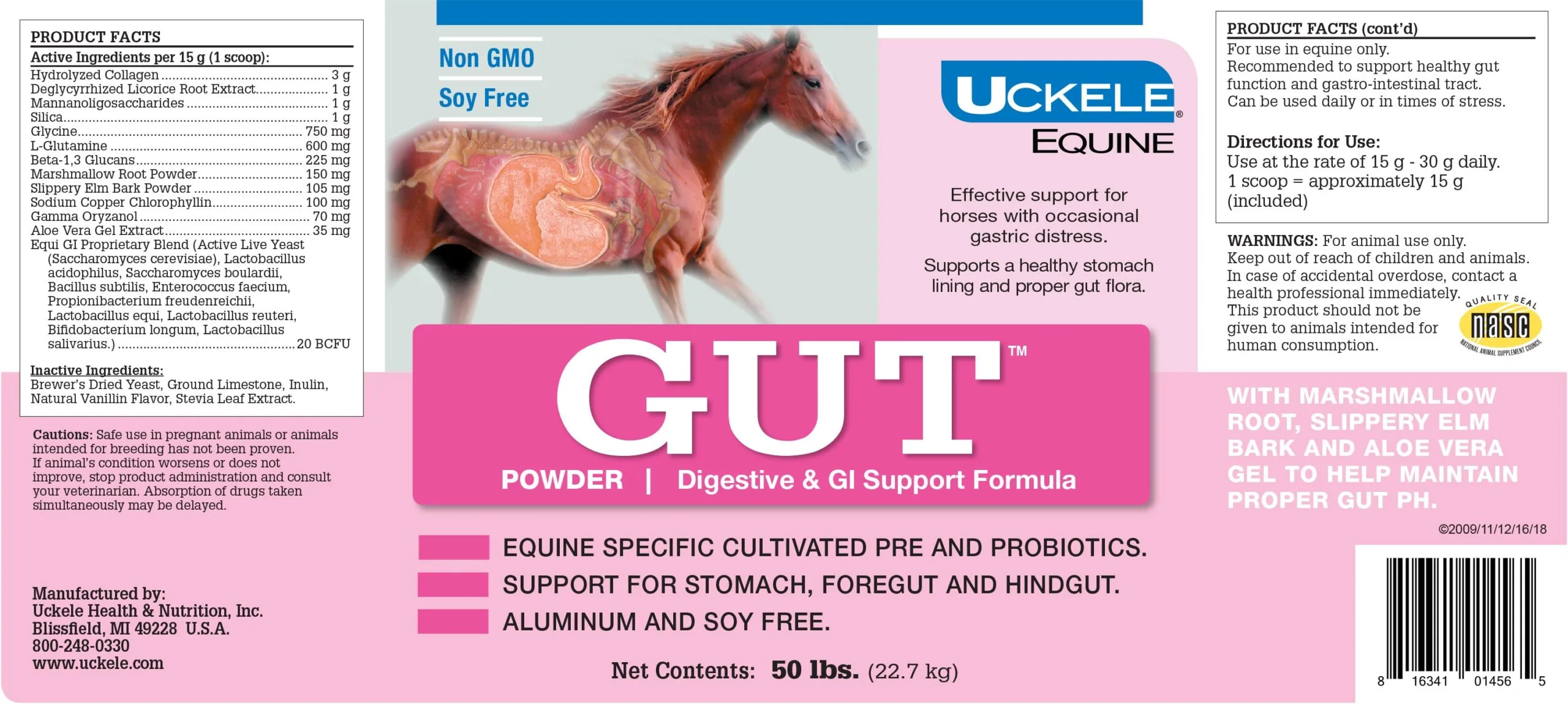 GUT™ Powder supports the horse’s full gastrointestinal tract by promoting healthy stomach lining, normal digestion and bowel function. The proprietary blend of Equi GI pre- and probiotics help maintain a proper gut flora without negatively affecting gastric pH. Added ingredients like marshmallow root, slippery elm bark, and aloe vera gel extract soothes and protects digestive function in a palatable powder form. GUT Powder is a great addition to any horse’s diet who is training, traveling, prone to gastric upset, experiencing fluctuations in hay or other daily changes to their routine. This effective and economical gut support is an important staple supplement for most horse feeding programs.