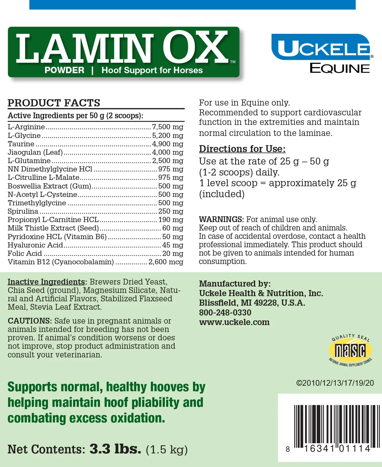 LaminOXâ„¢ Powder contains key ingredients that support hoof health and growth, maintain hoof pliability, and may assist in reducing excessive oxidation that can disrupt normal, healthy hoof growth. The formula includes jiaogulan, an herb that activates vascular function to promote circulation and structural hoof health, and amino acid arginine, which is a precursor to nitric oxide. Nitric oxide plays an important role in blood flow, which can help build a strong, healthy hoof. LaminOX offers a full-spectrum approach to supporting circulation, metabolic balance, and structural hoof health.