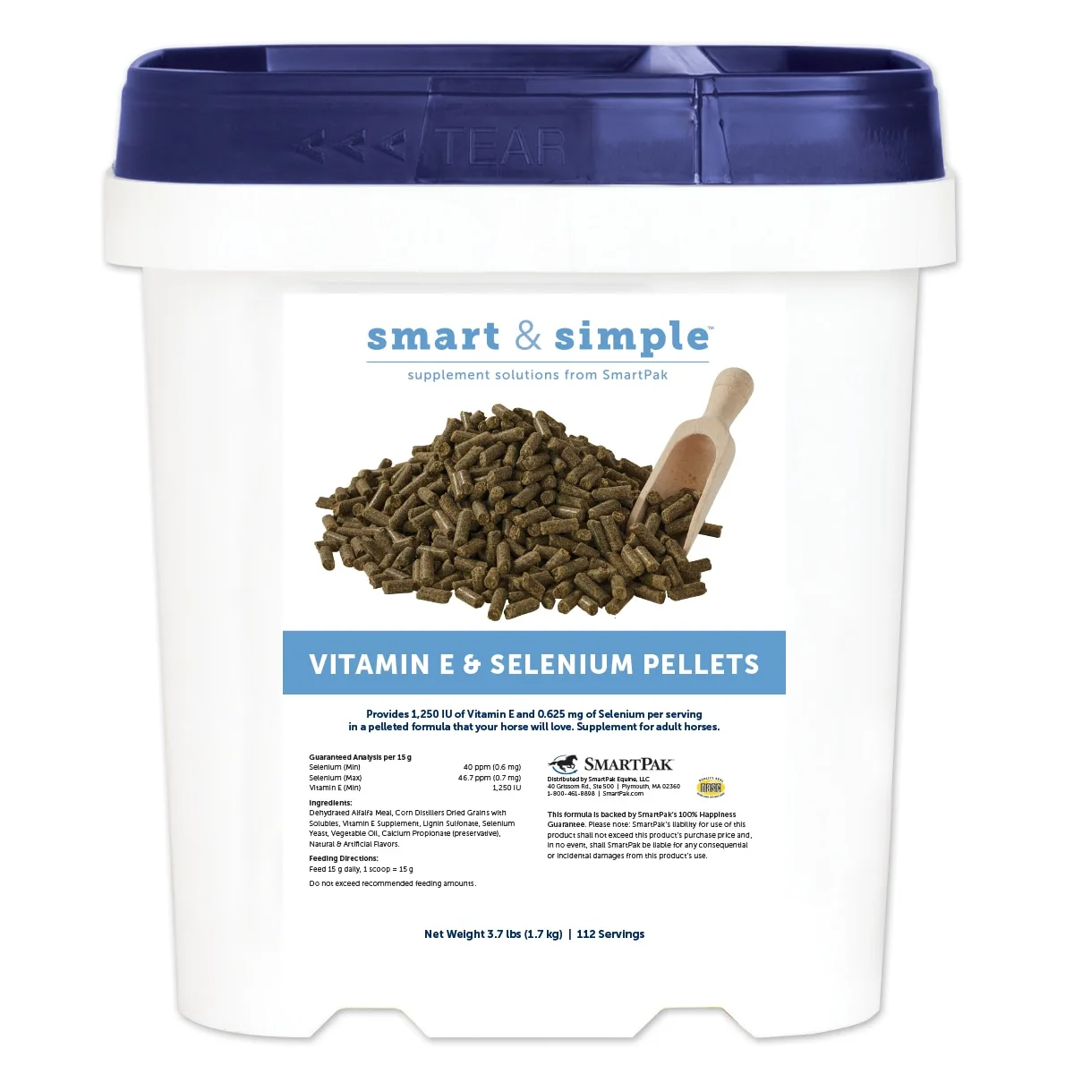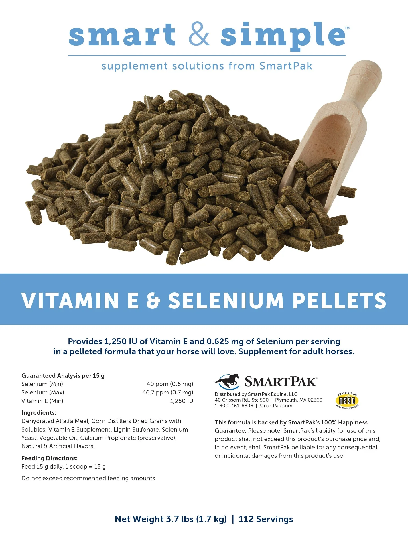Vitamin E and Selenium are important antioxidants that work together to support a healthy immune system and help neutralize free radicals, the damaging by-products of normal cellular activity. While vitamin E is found naturally in fresh grass, levels begin to drop the moment grass is cut for hay. In addition, many soils are deficient in selenium, making it hard to reach the recommended daily requirement of this mineral without supplementation. Smart & Simple Vitamin E & Selenium Pellets provide your horse with critical antioxidant support in a tasty pellet your horse is sure to love!