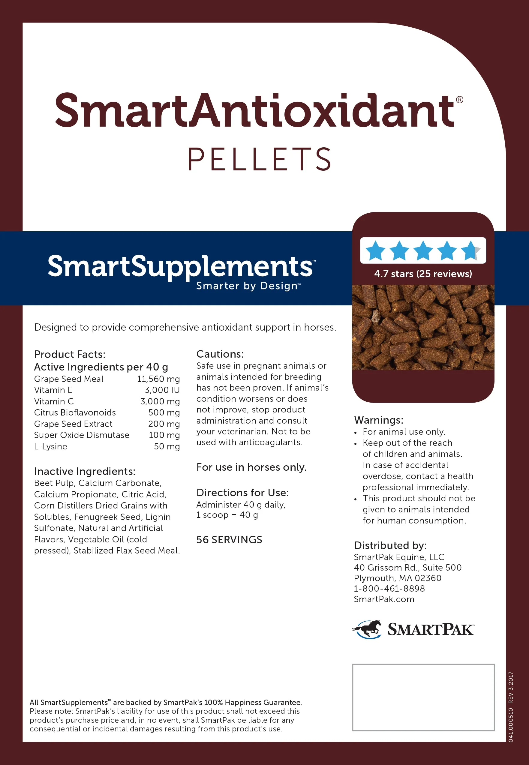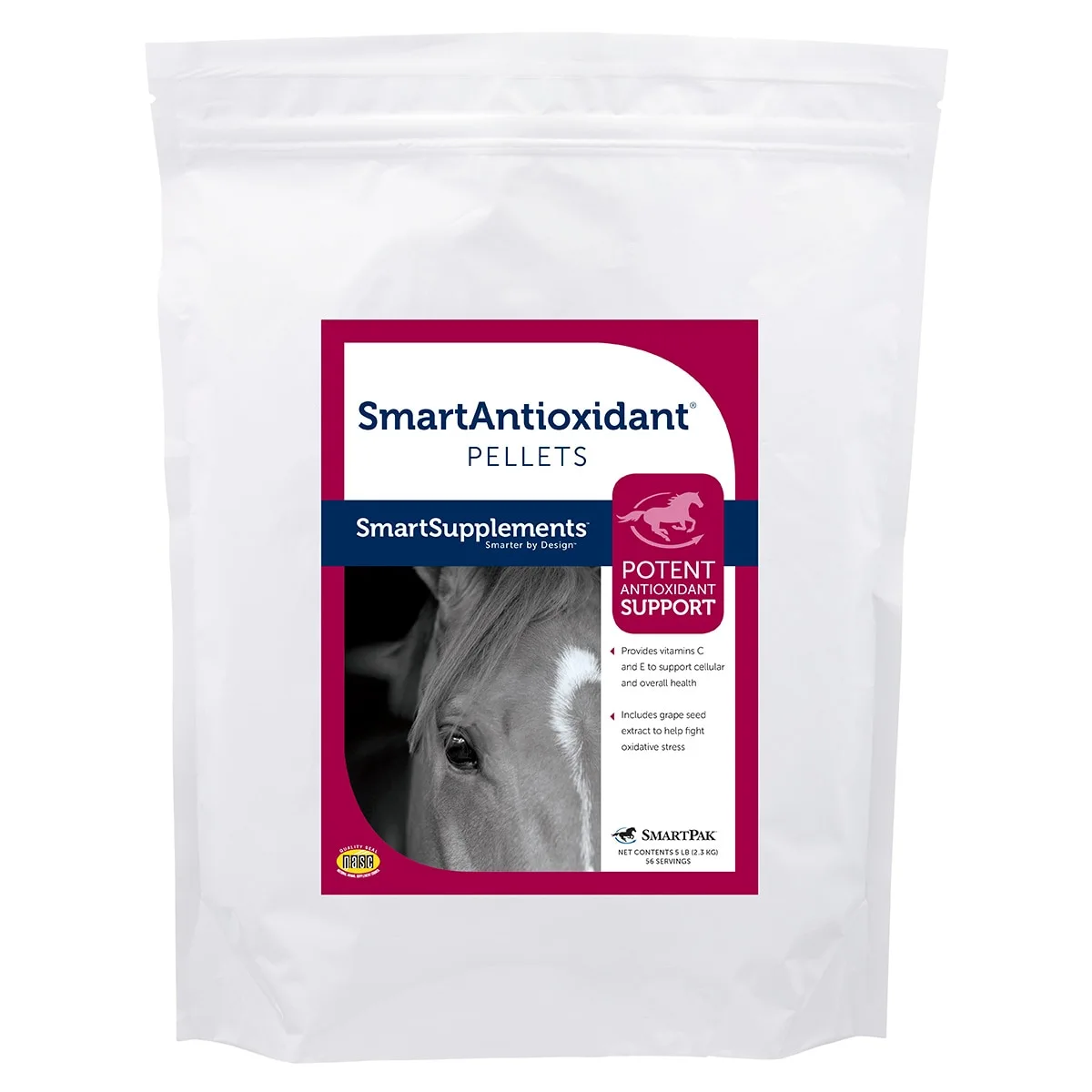 Antioxidants may help your horse’s body fight the damaging effects of free radicals and oxidative stress. SmartAntioxidant Pellets are a potent, cost-effective antioxidant formula containing vitamin C, vitamin E, grape seed extract, super oxide dismutase and citrus bioflavonoids. SmartAntioxidant Pellets provide excellent support for both senior and performance horses.